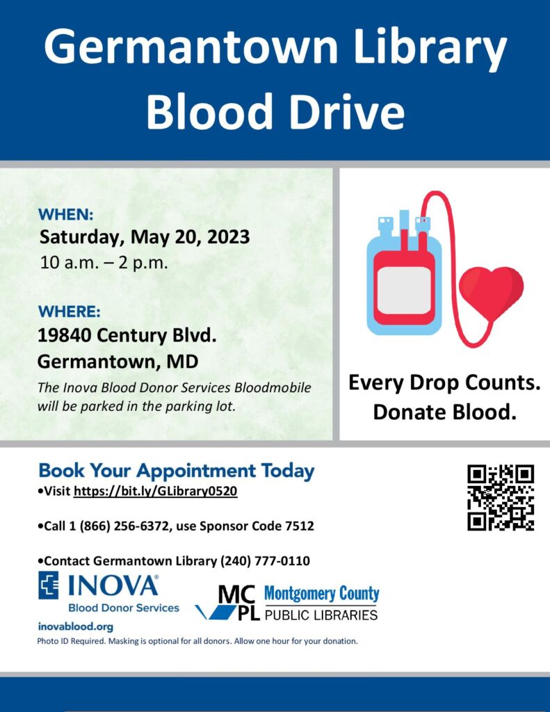 Will You Donate Blood at the Germantown Library Blood Drive on Saturday, May 20?