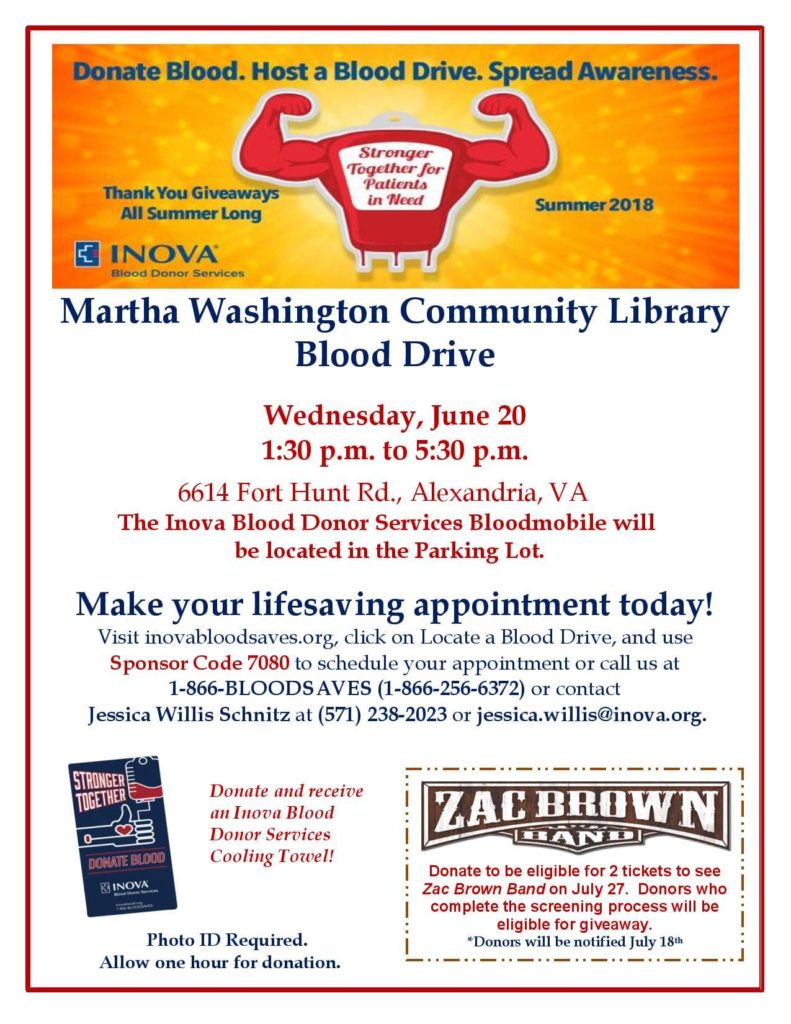 Will You Donate Blood Martha Washington Community Library Blood Drive on Wednesday, June 20?
